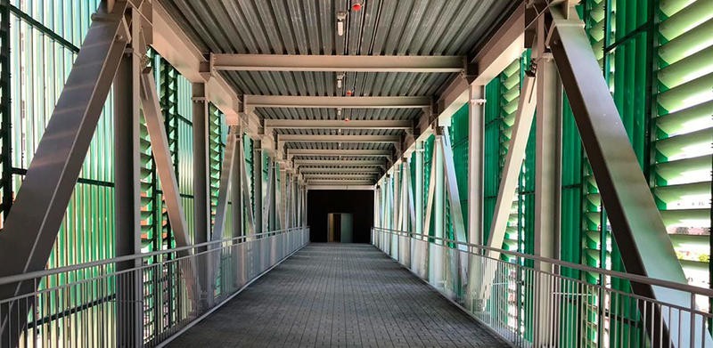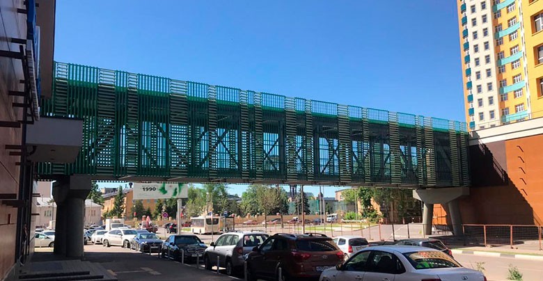 В подмосковном городе Королев введен в эксплуатацию надземный пешеходный переход, поставку комплекта металлоконструкций которого осуществила компания «МЕТАЛОН» совместно с «Обнинск Сталь Проект». Ширина перехода составляет 4,6 метра, а длина более 42. Свободный пролет при этом составил без малого 37 метров.
