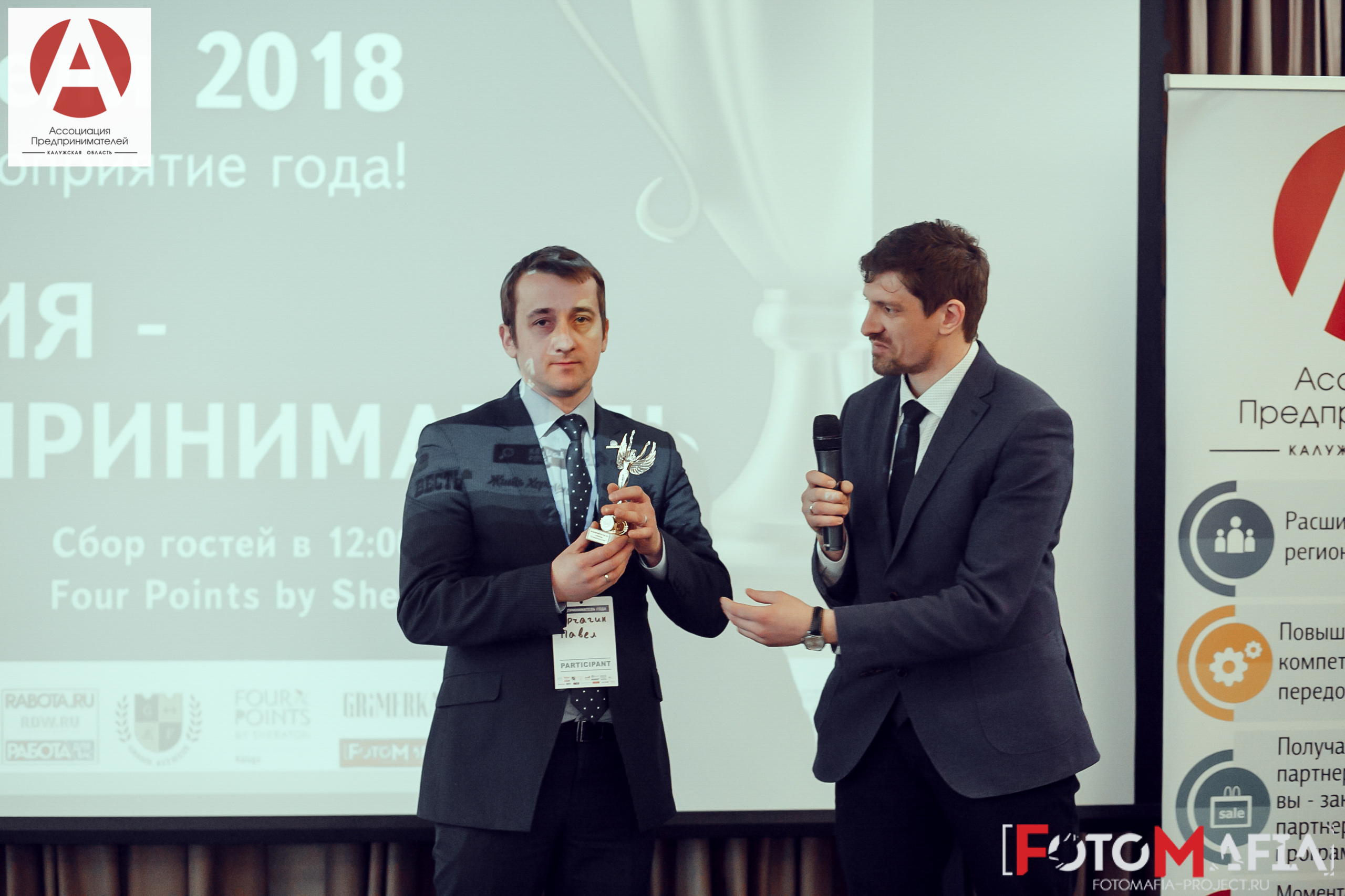 23 апреля были подведены итоги и прошло награждение победителей и лауреатов региональной премии «ПРЕДПРИНИМАТЕЛЬ ГОДА-2017». Ассоциация предпринимателей организует бизнес-премию уже в 6 раз. В 2017 году было подано большое количество заявок. Оценивали заявки члены ЖЮРИ, в которое вошли представители бизнеса различных масштабов и направлений, одни из которых: Игорь Стоянов - владелец и президент самой крупной в России и СНГ сети имидж-лабораторий «Персона». Игорь Чернин - владелец ЗАО "Калуга Астрал"; Денис Шаулин - председатель совета Калужского регионального отделения "Деловой России".